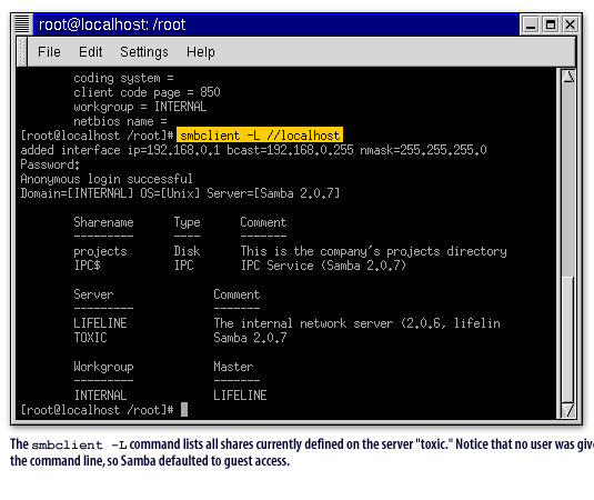 The smbclient program allows you to access your Samba server directly. This command, in some ways, imitates what a true SMB client would do. You can list shares, access shares, and read, write, copy, or delete files.
